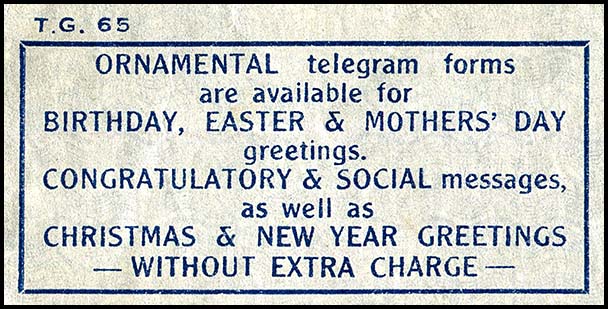 Ornamental telegram forms ... Used on the flap of ordinary PMG correspondence envelopes about 1937. |