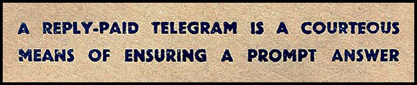 A REPLY PAID TELEGRAM... Used as the lower advertisement on the front side of ordinary rate delivery envelope AW-EO-14E. For a discussion of the Reply Paid telegrams, see elsewhere. |