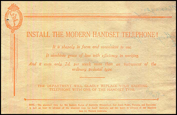 Advertisement on the reverse side for INSTALL THE MODERN HANDSET TELEPHONE! Has an orange Hermes image in an oval (type 3B). |