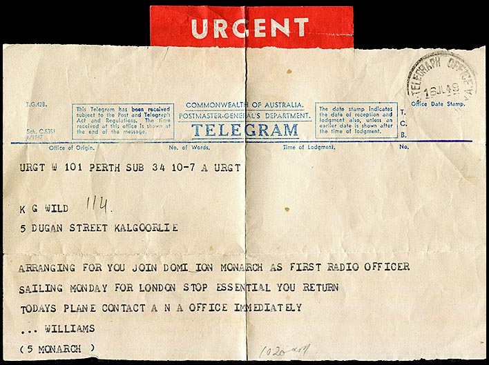 Possibly a cable from London via Perth to Kalgoorlie. A significant telegram for its contents. It was requiring Mr. Gerald Wild (later based in Exmouth W.A.) to immediately join the S.S. Dominion Monarch as First Radio Officer. This ship was one of the largest and most significant cruise ships in the world. She served the England - Australia - New Zealand route for two years before serving as a troop ship during the war and then returningn to civilian cruises. She could carry 535 passengers and a crew of 385. |