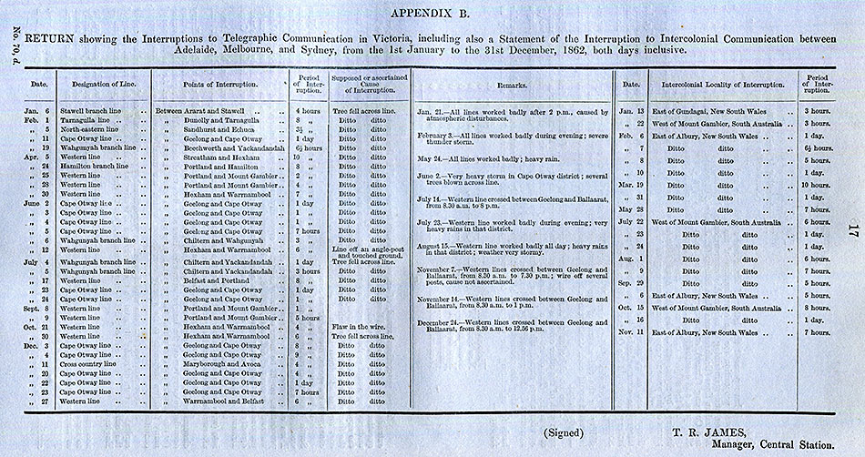 Appendix B: Interruptions to Telegraphic Communication in Victoria during 1861.