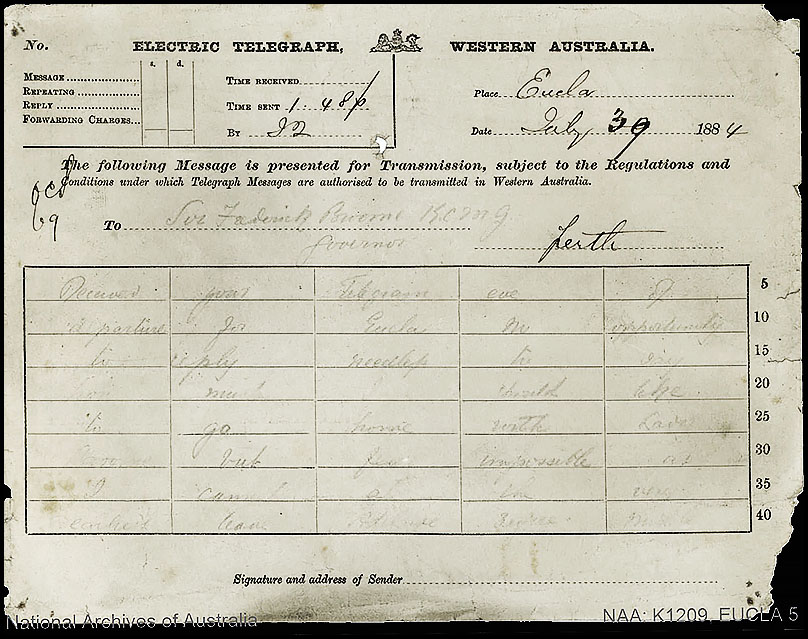 WC-TO-3A: transmission form dated 30 July 1884 used for a message from Mr. Lempriere to Hon. John Forest CMG - then Commissioner of Crown Lands. The message reads - to the best of my ciphering skills :-(.