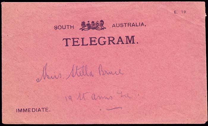 Heading and notes: Form number E. 19 in top right corner. Has TELEGRAM under the crest.