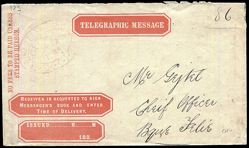 | Ordinary postal date stamps were also used on telegrams and delivery envelopes - especially after 12 June 1879 when the Post and Telegraphs Department issued an official instruction that all telegrams for delivery should be marked with a date stamp of the receiving office..