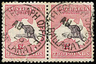 ![]() 10 August 1926. On a pair of £2 purple-black & rose 3rd watermark Kangaroo on map. |