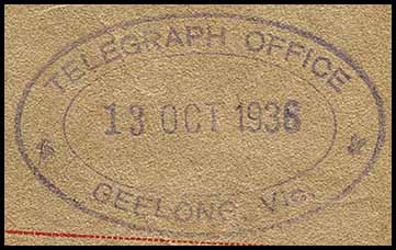 | Postal date stamps used on telegrams: | ![]() Geelong 23 August 1894. Used on telegram type VC-DO-15B. Diameter: 26 mm. |