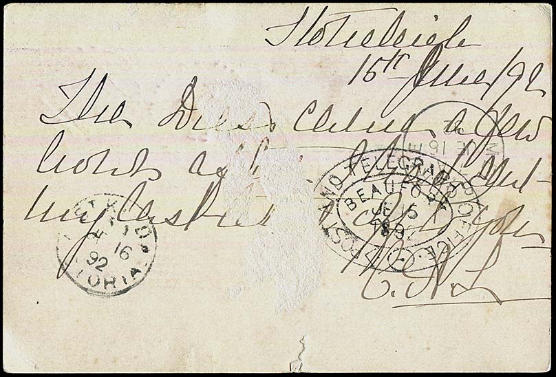 ![]() 15 June 1892. Used on the Post Card shown at right sent to St Kilda from Stockyard Hill. |