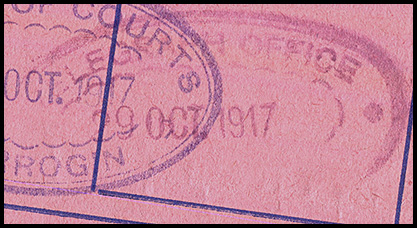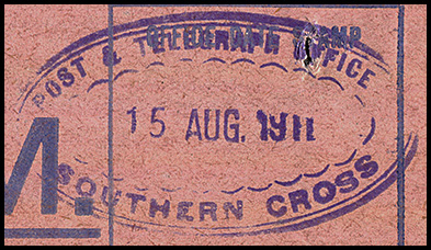 A rubber oval date stamp was issued to the office. PMI claims that the date stamp was only used between 5 August 1903 and 4 October 1904. Most sources claim that it was used in violet. There are two recorded examples. Both are incomplete strikes. Both have very small lettering around the outside of the oval but larger lettering for the central date. |
