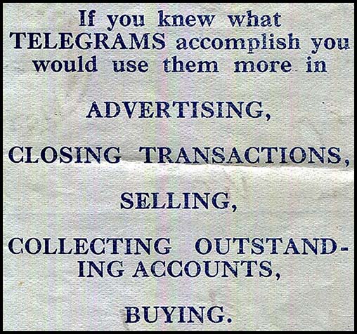 Over the years, advertising of telegrams and the telegraph service took many forms. Click on the hyperlink for the advertising approach about which you wish more details.