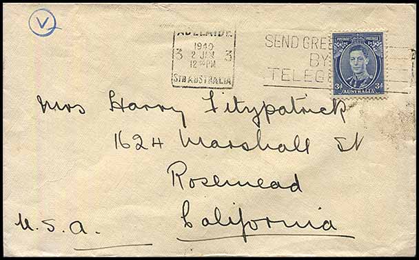 | The SEND GREETINGS BY TELEGRAM slogan is recorded as being used in Adelaide from  the first day of issue on 21 December 1932 to          8 January 1940.  Of the six identified formats used at Adelaide with this slogan: