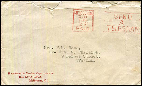Die 1: A spans the G of TELEGRAM.MELBOURNE is in 3 mm high letters.  Only recorded date of this format: 23 July 1940.