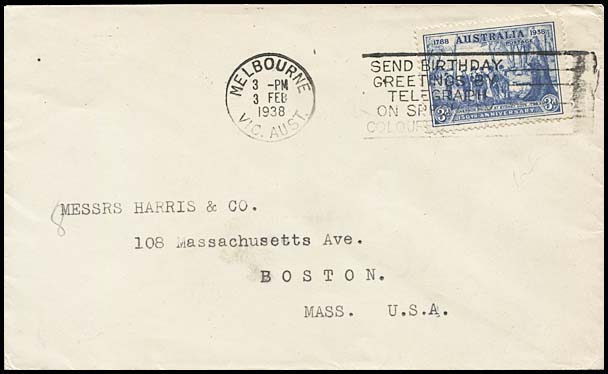 the D (of SEND) is above the 1st E (of GREETINGS); |  18 May 1938 at Sydney Pillar Box 1.