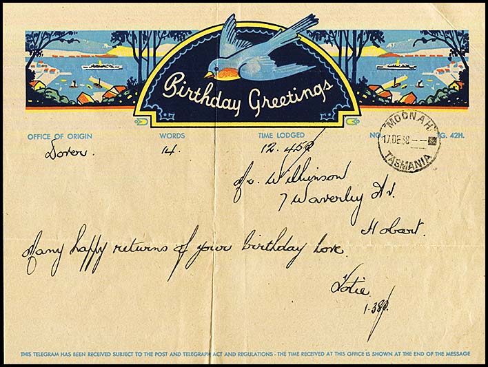 The telegram delivery forms with ornamental designs were all discontinued in 1942 also as part of the War effort.