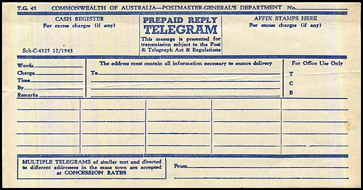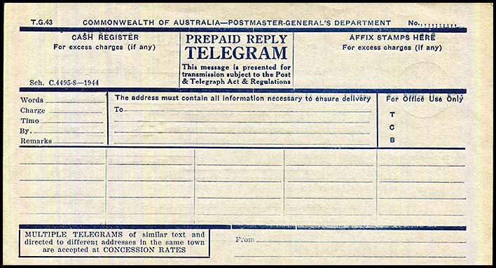 | Heading and notes: | Form number T.G. 43. Heading is PREPAID REPLY/TELEGRAM. Thick horizontal lines divide sections. |