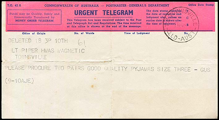 printed on cream paper with pink band over text;URGENT TELEGRAM NOT  printed on reverse side although there is a printed pink band;no schedule number;size 101 × 184 mm.formatting the same as for AW-DU-9B. |
