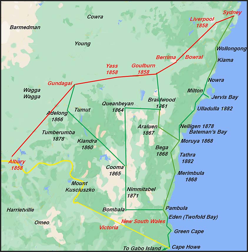 A little explanation of the details of this scheme may not be out of place. The line would not be more than 600 miles in length and, at the latest contract price, would cost but £30,000. It would pass through the following places with stations in the principal towns, viz. Wollongong, Shellharbor, Kiama, Shoalhaven, (station at either Green Hills or Nowra), Ulladulla, Broulee, Moruya, Clyde River, (station at Nelligen), Bega, Merrimbula, and to Eden — the last point of communication on our coast. From the main coast line, there might be branches extended to the Araluen Diggings and Braidwood, from Moruya and Nelligen; from Braidwood to Queanbeyan, and to Cooma and Bombala, from Bega and Eden, and a branch line might, when the new line of road is opened, be extended from Shoalhaven to Goulburn.