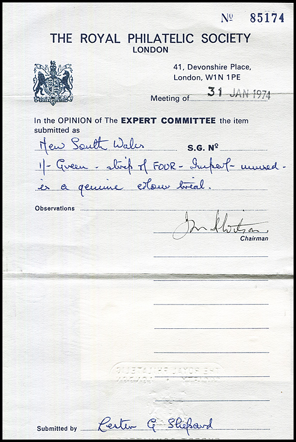 The 1/- green inter-panneau strip of 4 sold at the May 2024 Abacus Sale (Lot 416) also has two important documents with it (thankfully):