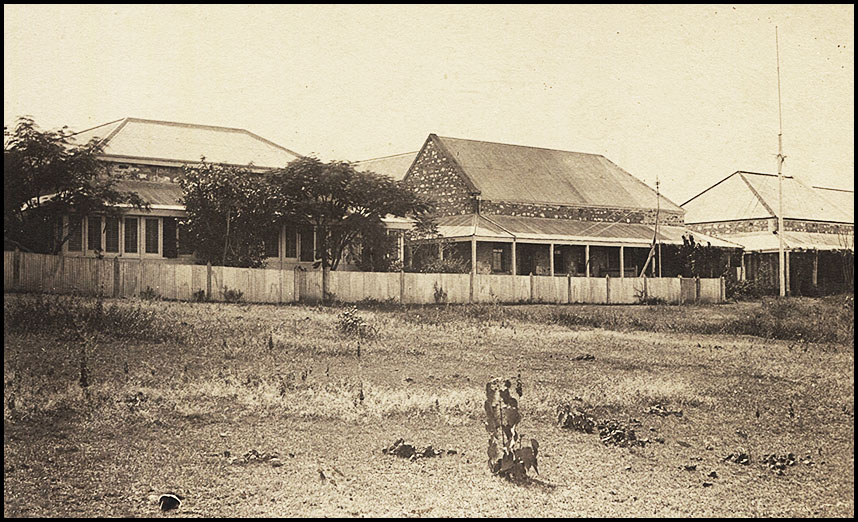 The buildings were of stone, roofed with iron and were surrounded by a broad verandah; the floors were concrete to prevent the woodwork being destroyed by white ants. There were also outbuildings for stables, stores, workshops, &c., and two large underground tanks, each capable of holding 12,000 gallons of water. The buildings stood on four acres of ground, fenced in and half of which were conveyed to the Company, who of course paid for the cost of their portion of the building.