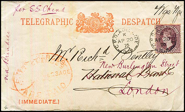 G.P.O. Adelaide to London. Has a scarce oval Characteristics: