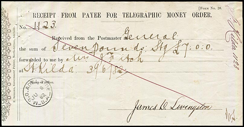 No Telegraphic Money Order forms are recorded for South Australia. An early receipt for an order is known.