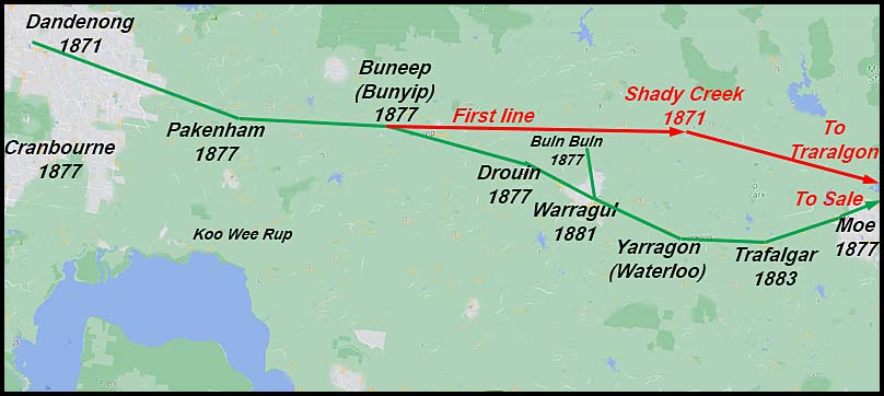 | Wilson's Promontory Line (No. 1 East): | Wilson's Promontory, Foster, Port Albert, Tarraville, Sale, Rosedale, Traralgon, Morewell, Moe, Yarragon, Trafalgar, Warragul, Drouin, Pakenham, Berwick, Dandenong, Oakleigh. | Port Albert
