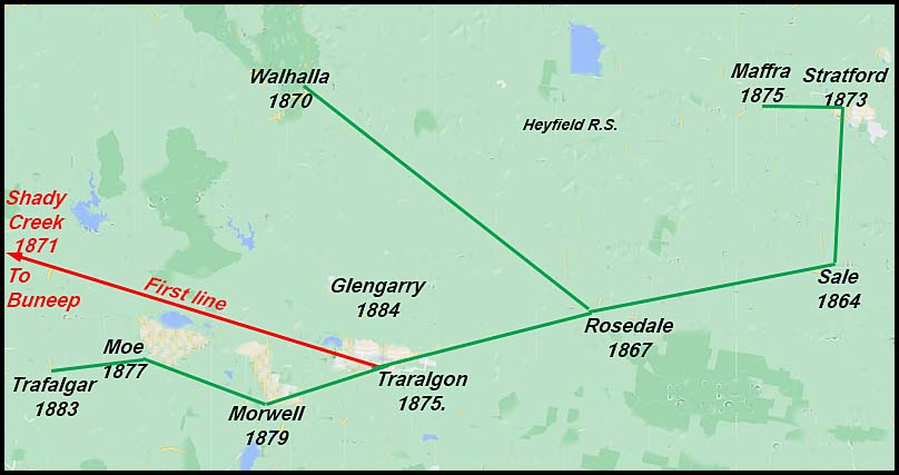 In 1875, plans prepared earlier for the Gipps Land Railway line were being made available at the district survey office. Those plans showed the portion of the second section of the line linked the Buneep and Shady Creek, while those for the remaining portion detailed the route from Shady Creek to the Morewell. These plans would have been very influential in planning the next routes for the telegraph and for the roads.