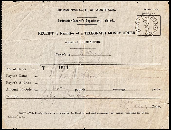 Post Federation examples of Money Order Receipt forms for Victoria.