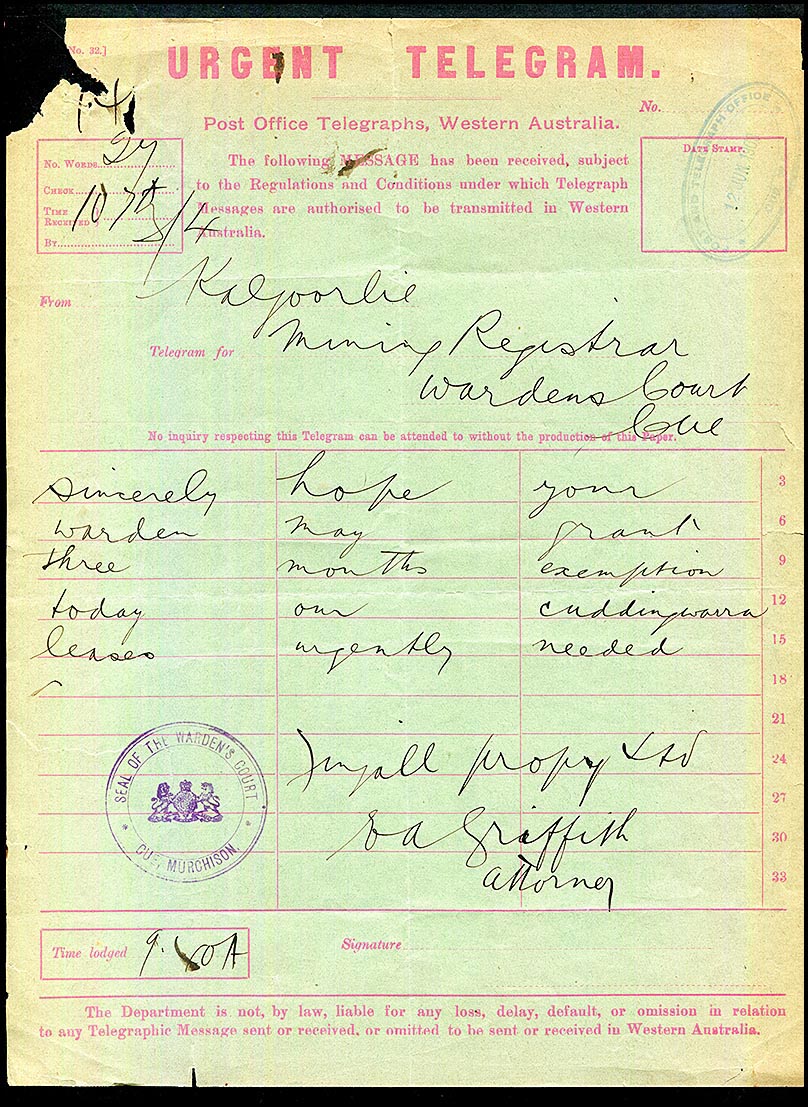 URGENT TELEGRAM above POST OFFICE TELEGRAPHS, WESTERN AUSTRALIA.