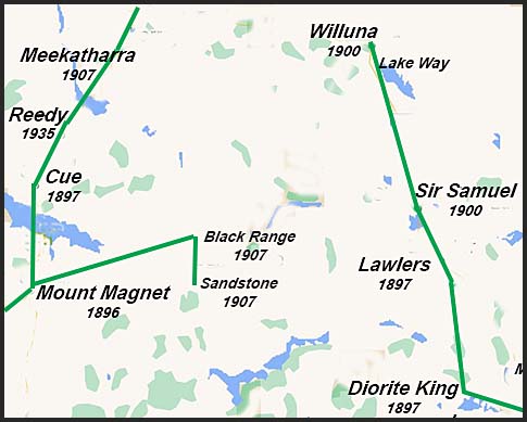 About half way between Mount Sir Samuel and Mount Magnet is a town called Sandstone - about 100 miles (160 kms) east of Magnet. It was gazetted in 1906. To the north was Black Range (proclaimed in 1902). They are in the western part of East Murchison.