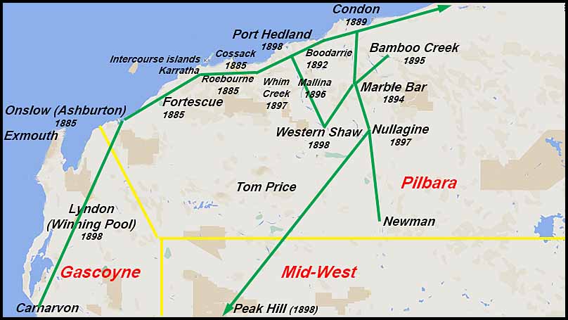 The line from Carnarvon in the Gascoyne region to the north via Lyndon (Winning Pool) was constructed by the Carey team at the end of 1884. A telegraph office had been opened at Carnarvon in August 1884 but no other Telegraph Offices were constructed to the north until the line reached Ashburton (Onslow) where an office was opened in July 1885. A gold field had discovered in that place in 1879. Intermediate stations between these two places were constructed later.
