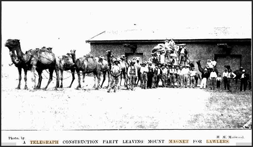 | "Our illustration was taken at the railway station, Mount Magnet, as the camel team was on the point of leaving with the camp equipment for Lawlers. After reaching Lawlers, the team will be used for carting the telegraph material from Lawlers to Lake Way line, a distance of 120 miles. The camels take very kindly to this style of work, and are as tractable and easily driven as bullocks. They should be particularly serviceable on this road of long, dry, and sandy stages. Amongst the spectators is Mr. William Cant (the fourth man from the left of the picture). This old gentleman was a member of the Austin Exploration Party (1854). He subsequently visited the district in the two following years but until recently, when he paid a visit to his son, he has not since seen the place. He is now 80 years old, well and hearty, and still clings to the hope that the Government will recognise his party as the first to discover gold in Western Australia. One of the construction party was superstitious. He pointed out that the party numbered thirteen, the animals thirteen and they were making a start on a Friday". |