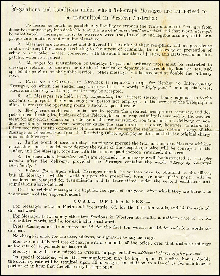 | Heading and notes: | No form number. ELECTRIC TELEGRAPH WESTERN AUSTRALIA spans the central crest. |