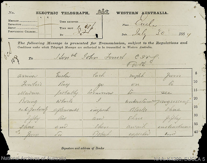 WC-TO-3A: transmission form dated 30 July 1884 used for a message from Mr. Lempriere to Hon. John Forest CMG - then Commissioner of Crown Lands. The message reads - to the best of my ciphering skills :-(.