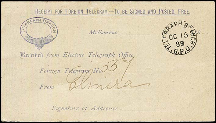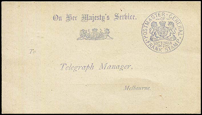 | Heading and notes: | No Form number. Has Victorian POSTMASTER-GENERAL Frank Stamp on the front. Has TELEGRAM BRANCH logo on the reverse. |