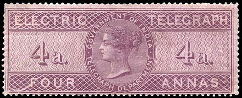 | 4 rupee Electric Telegraph. Issued 1861. One of the great rarities of India and of world telegraph items. Gartner August 2011 Lot 1298 (EUR 32,000). |