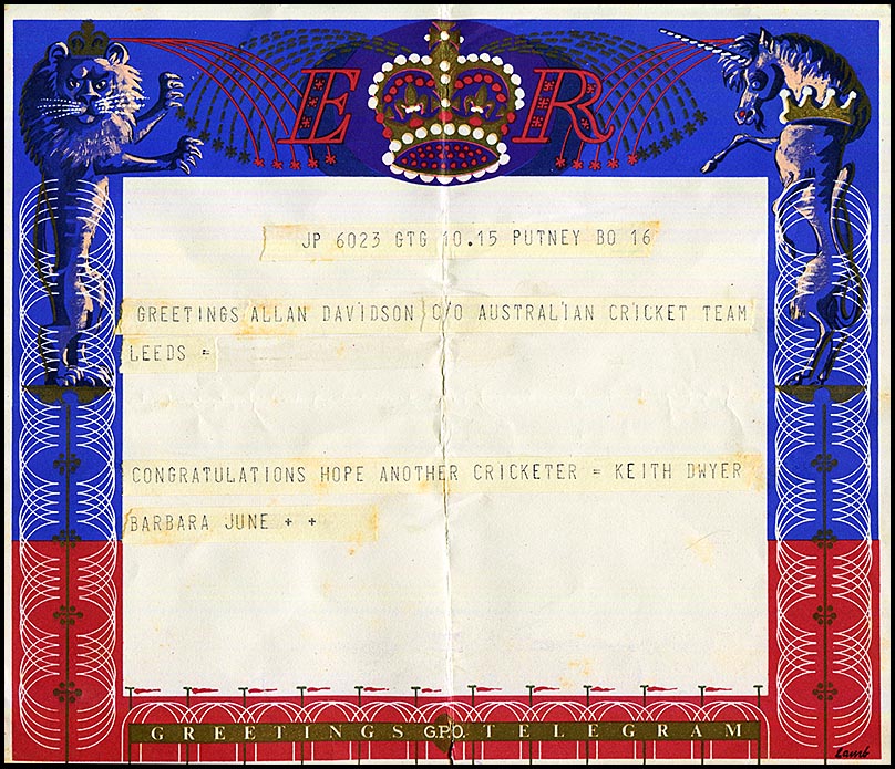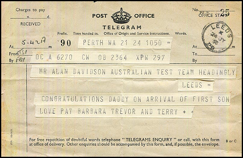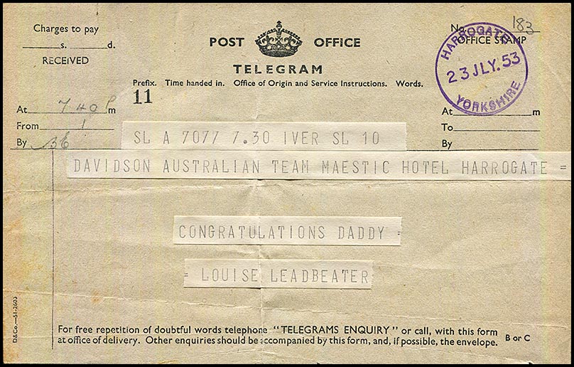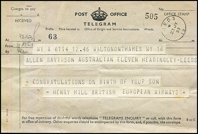 ![]() 24 July 1953 - Telegram to Alan "Congratulations Daddy ..." from Pat and family. Leeds date stamp and addressed to the Headingly Cricket Ground. |