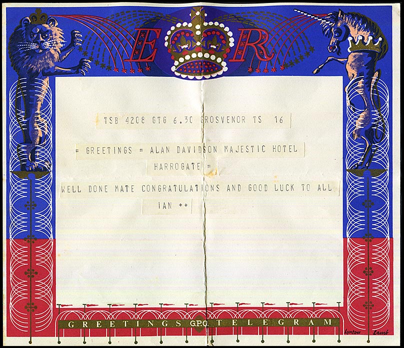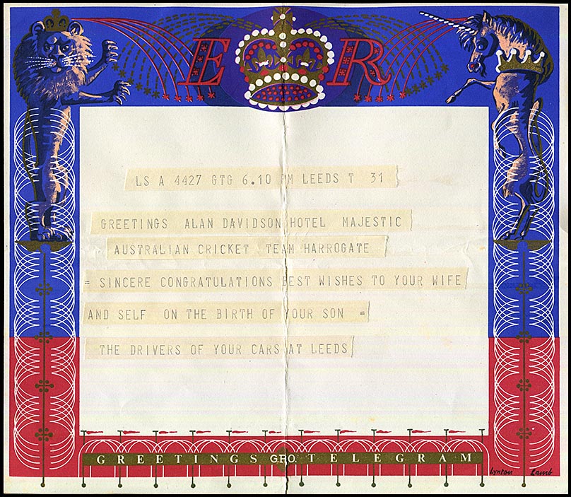 At the time of the birth, Alan was touring England with the Australian Team.![]() 23 July 1953 - Telegram to Alan and Betty from the Drivers of the cars provided to the Touring Australian cricketers. Message recorded on a special QE2 GPO Greetings form (about 7 weeks after the Queen's Coronation). |