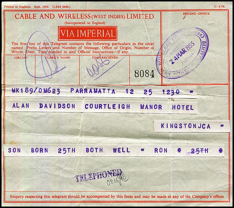 At the time, Alan was touring the West Indies with the Australian Team.![]() Telegram from Ron (?) to Alan informing him of the birth of his 2nd son on 25 March. Sent through Cable and Wireless from Parramatta to Kingston, Jamaica where it arrived on 24 March 1955. Interesting juxtaposition of dates solely attributable to the time difference with Kingston - and not premature birth. |