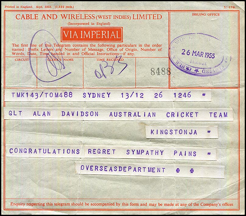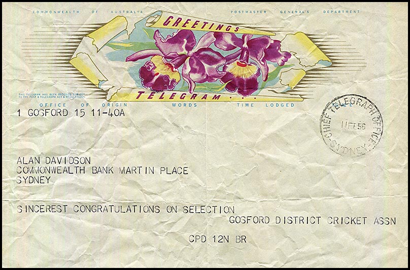 Alan Davidson from NSW (1929 - 2021) was one of the great fast bowlers in Austraian cricket history. Even after he stopped palying Test cricket, he continued to contribute to the development of the game nationally and internationally in various ways. He played 44 Test Matches accumulating 1328 runs at an average of 24.6 and took 186 wickets at an average cost of 20.53 runs. He played for Australia in the famous tied Test against the West Indies - unfortunately breaking his little finger on his bowling hand during catching practice on the eve of the match. He refused to withdraw after a motivational speech to the team by Don Bradman. Despite his bad finger, "Davo"Parts of Alan Davidson's life are recordeded in telegrams: