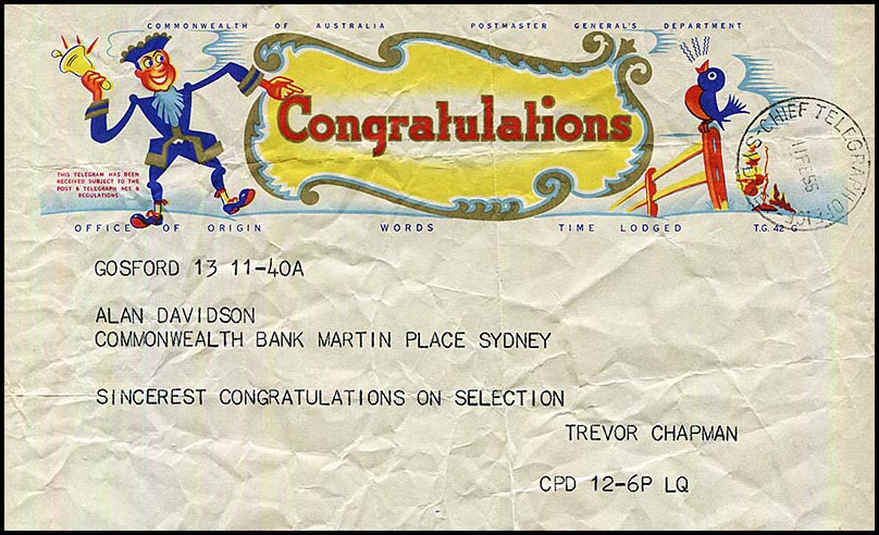 A Greetings Telegram (AW-GC-F-54B) sent to Alan at the Commonwealth Bank from Trevor Chapman in Gosford. |