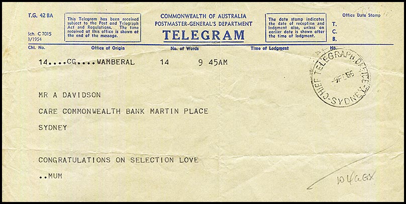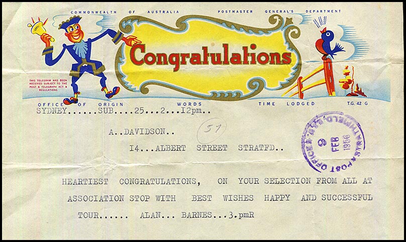 ![]() Telegram from Mum (Hilda) - and probably also Dad (Leslie) - on 9 February 1956 to Alan congratulating him on his selection to the Australian team to tour the West Indies. As was usual, Australian cricketers had to work normal jobs because cricket did not pay in those days. Hence the delivery address to the Commonwealth Bank in Martin Place. In 2013, Alan appeared in a TV advertisement for the bank. |