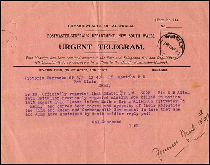 Victoria Barracks to Manly Confirmation that Private R. B. Allen of the 13th Battalion had been killed in action. |
