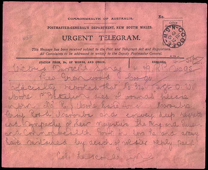 Victoria Barracks, Sydney to Coogee, NSW (21 July 1915). Urgent telegram requesting Rev. Greenwood to notify the father of Sergeant Oswald Walter Moore of his son's death. Sergeant Moore (324) was a member of the 1st Battalion, C Company Australian Infantry, A.I.F. He had enlisted at Sydney, New South Wales. Sergeant Moore was the son of Sarah Lydia Moore of "East Anglia", Maroubra Bay Rd, South Randwick, NSW He was born in Dunedin, Otago, New Zealand. |