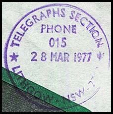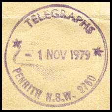 A steel circular type 2C TELEGRAPHS DUBBO date stamp was issued to the Office for use on telegrams as well as for other purposes. This type has a full-stop after the W. A type 2A (no full stop after the W) was apparently used between 1915 and 1921 on telegrams. |