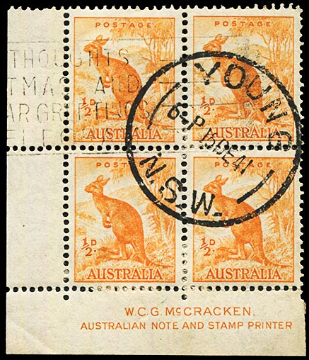 | A Type 1A date stamp, which has been used for postal purposes between 1867 and 1880 was used on telegrams between 1910 and 1914. | ![]() Young postal date stamp. 15 December 1941. Cancelling a McCracken imprint block of 4 and with a slogan cancel for: Happy Thoughts ! Christmas and New Year Greetings by Telegram. |