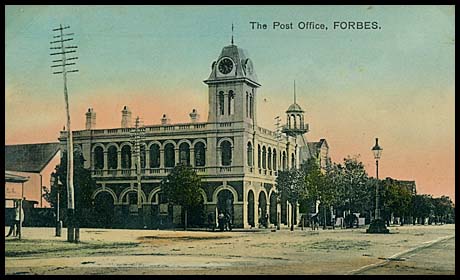 In the Legislative Assembly of 30 May 1862, Mr Weekes stated in answer to a question from Mr. Wisdom that "it was not intended to extend the present postal accommodation at Forbes, on the Lachlan, otherwise than by the erection of a new post-office in connection with the telegraph office". The Gazette of 11 July 1862 noted that the tender submitted by Mr. Peter Graham for the erection of a Telegraph and Post Office at Forbes had been accepted. In September 1862, a reef was opened behind The Observer office in Forbes and gold was discovered. The Bathurst Free Press of 1 November 1862 questioned how Forbes could continue to exist with such a large population yet no gold being exported, etc. The Pastoral Times of 2 April 1870 printed a traveller's tale in which it is said "Forbes itself presented all the appearance of a place that had been thrown together by chance. The irregularity and narrowness of the streets struck me forcibly if I might accept the Courthouse square—not but Forbes has some good buildings: the Court-house, well enough in its way; the Mechanics Institute, a nice little structure; the Telegraph and Post Office, right enough; the two banks and Thomas' new store, certainly worthy of a thriving town". In November 1878, a tender was accepted from Mr. R. M. Vaughan for the erection of a Post and Telegraph Office at Forbes. The Maitland Mercury of 25 September 1866, citing its Lachlan Reporter, revealed an interesting twist to the Forbes' personnel: "In consequence of Mr Atkyns, the Postmaster, not making his appearance at the Post Office on Monday last as usual, inquiries were set on foot which led to the discovery that he had started by the mail coach on the Sydney Road that morning. The authorities in Sydney were subsequently communicated with by telegraph, and on Friday the police received instructions to take charge of the office. Up to the time of going to press this morning, no further definite information had been received respecting Mr. Atkyns' movements than that he had travelled by coach as far as Bathurst, where it appears he was lost sight of last evening. Mr. Thompson of the Bathurst Post Office arrived by coach to relieve the police of their charge. This is all that can be said with certainty of this unfortunate circumstance at present, but possibly the coming week may throw some further light on the mystery with which it is at present surrounded". November 1862: Mr John Buckle was appointed line inspector but was transferred in January 1863 to be line Inspector at Bathurst. May 1867: Mr Alfred Tunks, now Station Master and Line Inspector at Forbes, was appointed Station Master and Line Inspector at Penrith.