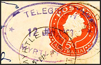 | Only one format for a Myrtleford date stamp related to Telegraph work is recorded. It is a RO2-T format : |