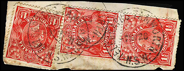 ![]() Type 2A datestamp with side arcs but no full stop after W. Printed in red ink on 2/- Roo which was a common high value rate on telegrams. |