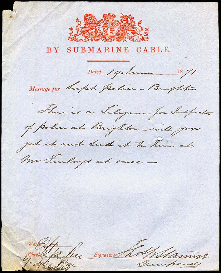 "This is a Telegram for Inspector of Police at Brighton - will you get it and send to him at Mr. Finlays at once".
