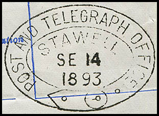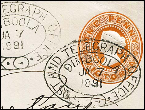 The Telegraph Office was Gazetted on 14 September 1877 as having been opened. On 1 January 1879, a Telegraph Office was opened at the Railway Station. No special date stamps were used for telegrams. |